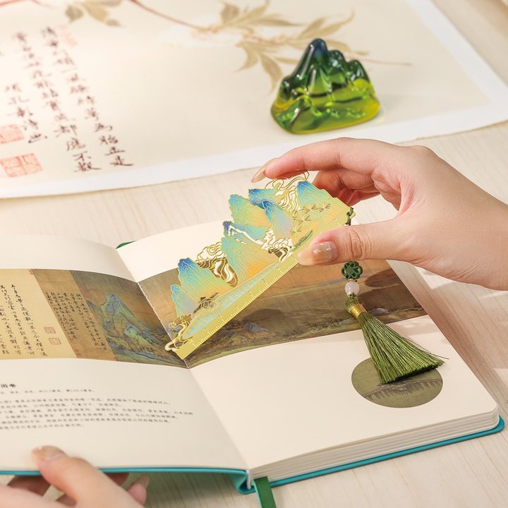 将《千里江山图》山河浪漫揉进画里,以石青、石绿泼染出千里峰峦叠翠,烟波浩渺间藏着大宗的日升月落。