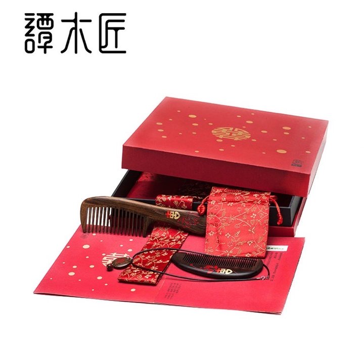木梳选用沉贵宝木制成,木纹雅致,线条流畅,整套礼盒喜庆又大方。
