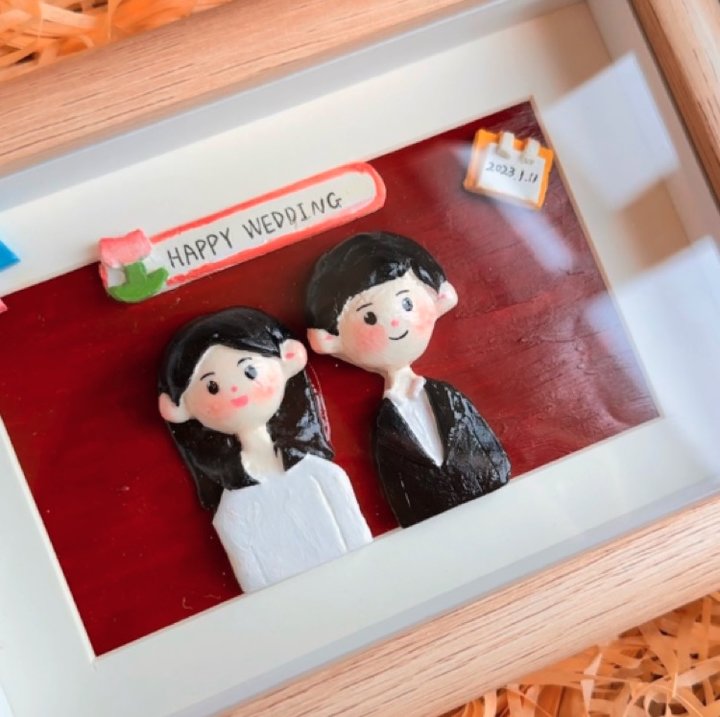 定制粘土相框把照片发给店家,加入新婚的小元素,装裱一个简单的小相框,效果就很可爱了。