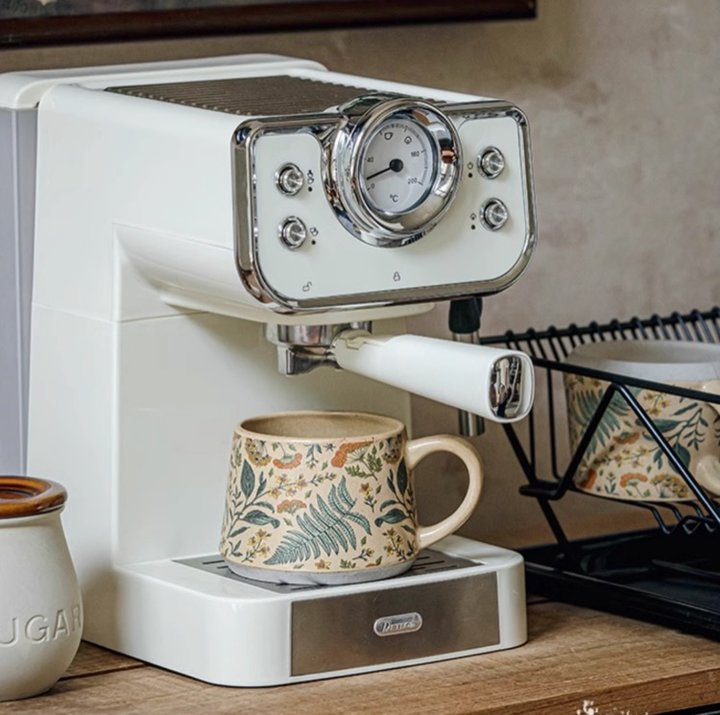 当清晨的第一缕阳光洒进窗台,捧起这只中古风马克杯,手绘的繁花在杯身悄然绽放——复古的笔触勾勒出鸢尾、玫瑰与雏菊的轮廓,仿佛将整个花园捧在掌心。