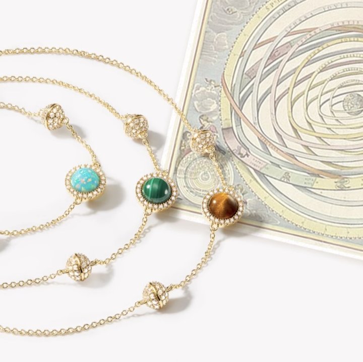 Lola Rose日心说系列手链,就承载了宇宙的终极浪漫,用天然宝石的自然多彩纹理来体现星球的质感,这个设计也太妙了~