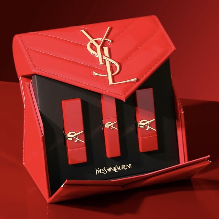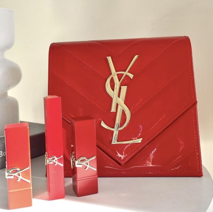 YSL的限定礼盒真的是别出心裁,包包的造型瞬间让人心动,热烈的红色漆皮搭配着金色的浮雕logo,满满的高级感。
