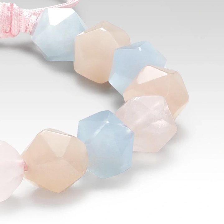 来自马达加斯加的粉晶,寓意着幸福、治愈;桃石寓意着和谐、好运;海蓝宝寓意着保护和能量,送上这条珍宝珠手链,也希望对方好运连连。