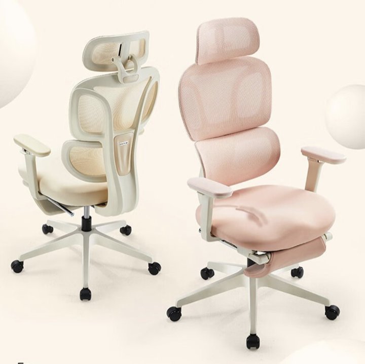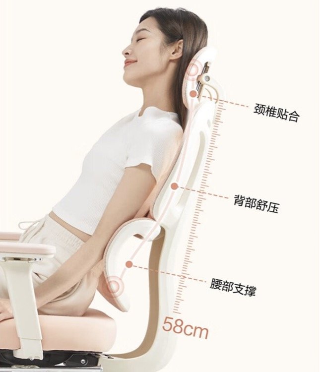 这款适合女生的人体工学椅,从头枕最高点到坐面最低点有 58cm,较常规款低 4cm,更适合 150~175cm 的身高区间。