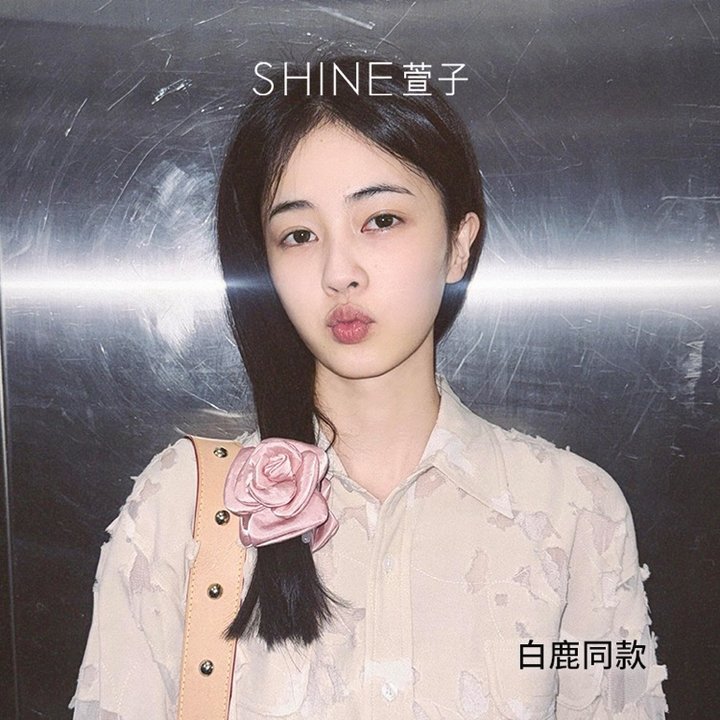 粉色小花苞设计得很逼真,像一朵真的玫瑰花别在了头发上。而且侧马尾扎着更显明媚了,让穿搭也没有那么单调。
