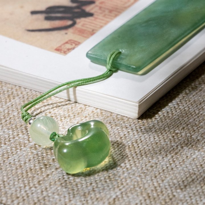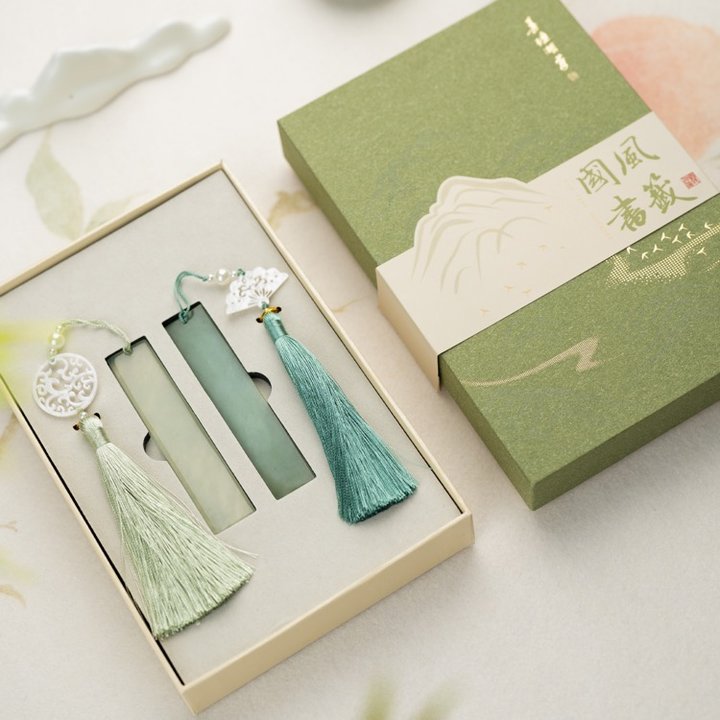 这套玉石书签礼盒,玉材名为「岫岩玉」,成色通透翠绿,触感温润细腻,美得像一件穿越千年的艺术品。