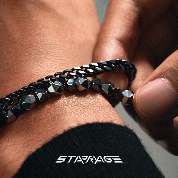 这条几何金属手链乍看专属于酷酷的男生,实际上不挑人。由龙骨链和黑胆石+太赫磁石两根链子构成。