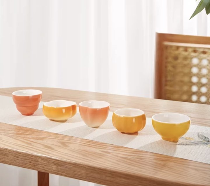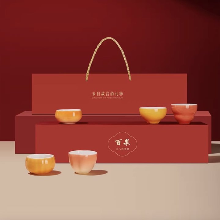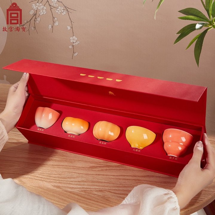 这套百果主人杯,精选桃、柿子、葫芦、橘子、南瓜五种造型——福气、贵气、喜气、朝气、和气,五气齐聚。