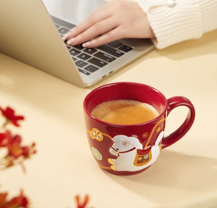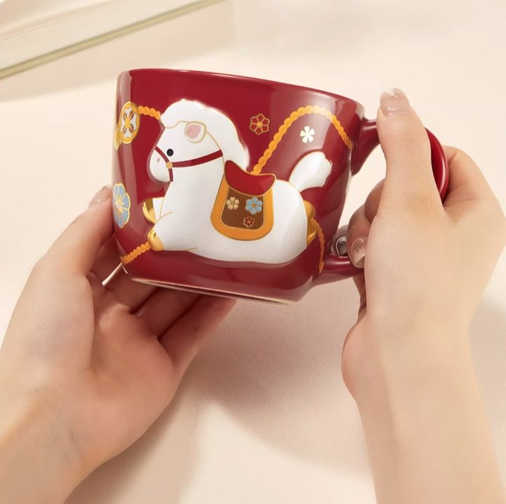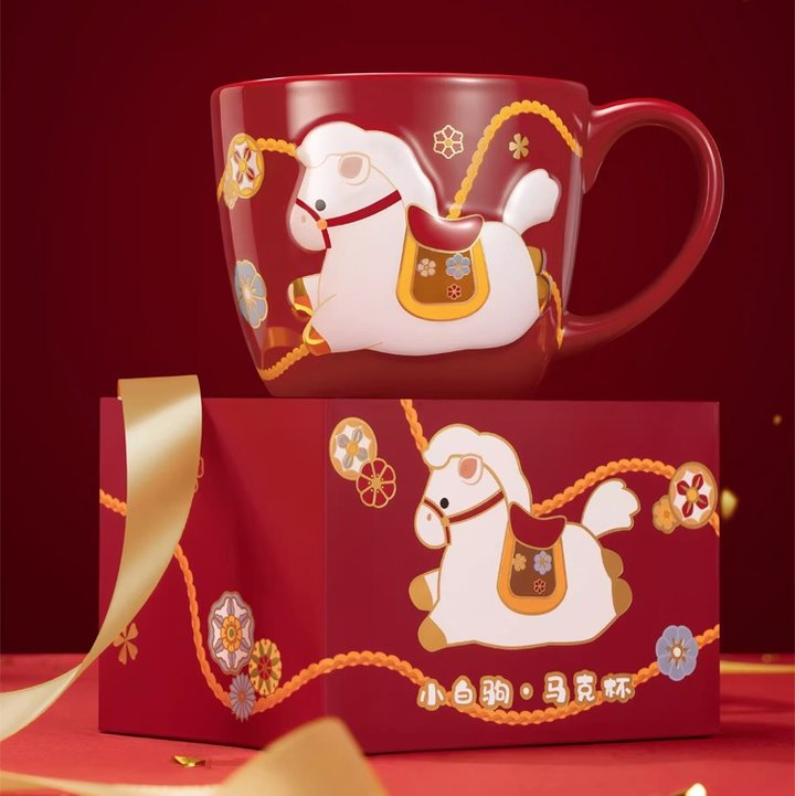 这只小白驹马克杯,设计太绝了。喜庆的正宫朱红釉,质感高级。杯身上的小白马采用浮雕工艺,低头饮水的姿态凹凸有型,灵动传神。