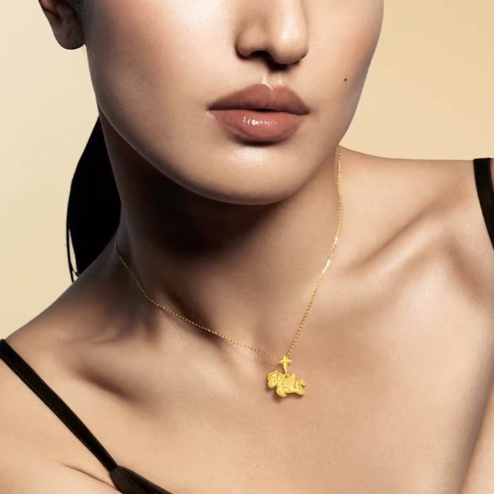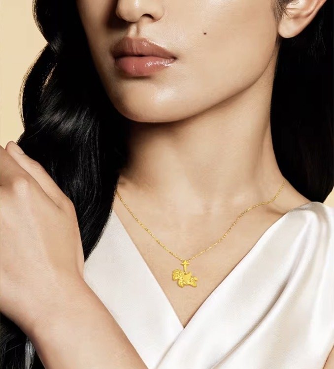 周大生这款小飞马吊坠,用独特的“碎碎冰”工艺,让黄金折射出如星芒般细碎闪耀的光。