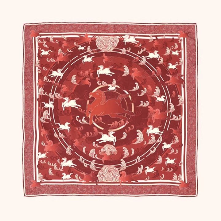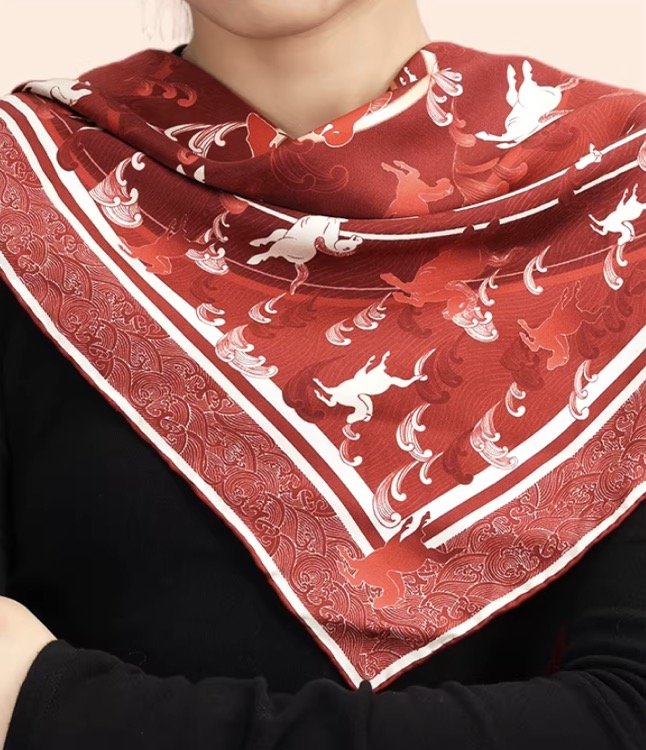 这条马年限定丝巾,将江南的雅致与新春的喜庆完美融合,红色调高级显气色,寓意“马跃新程”。