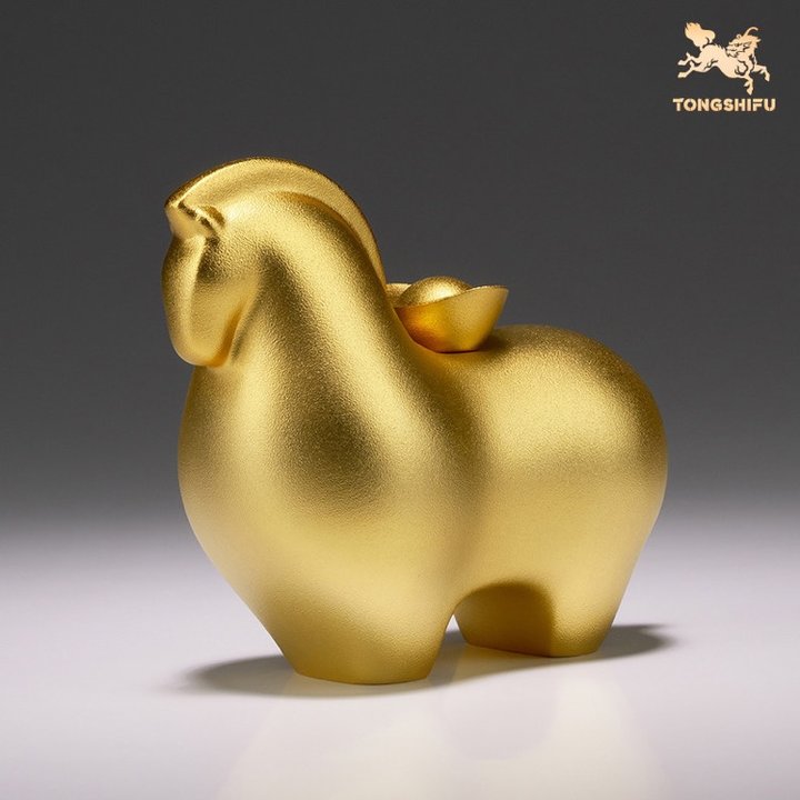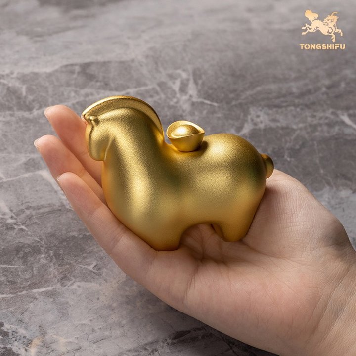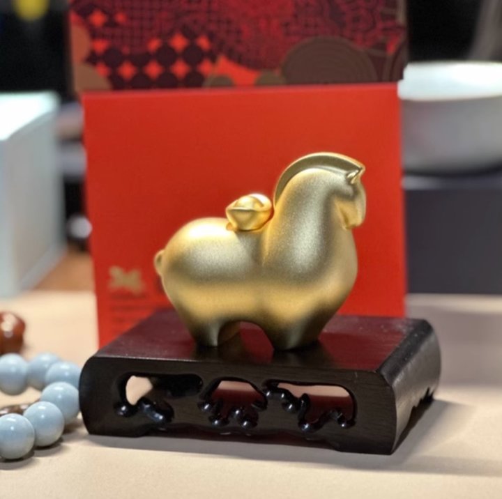 一只胖墩墩、沉甸甸的“小财神”马!通体黄铜铸造,表面镀有24K真金,是那种高级的磨砂金光泽。