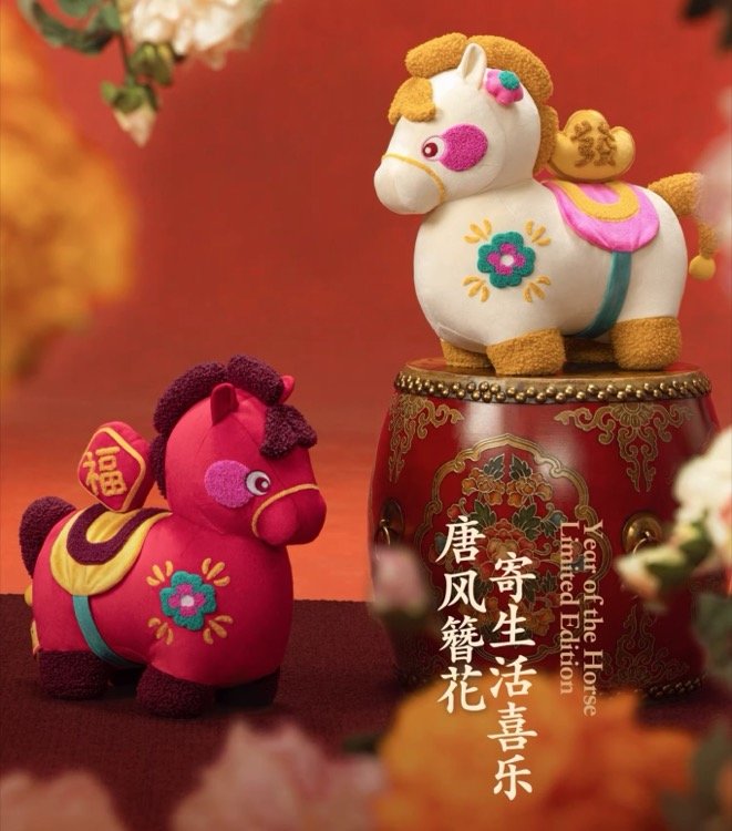 灵感源自唐代尊贵的“三花马”和簪花风尚,奶呼呼的绒毛搭配粉彩马鞍,国色牡丹刺绣点缀,古韵又灵动。