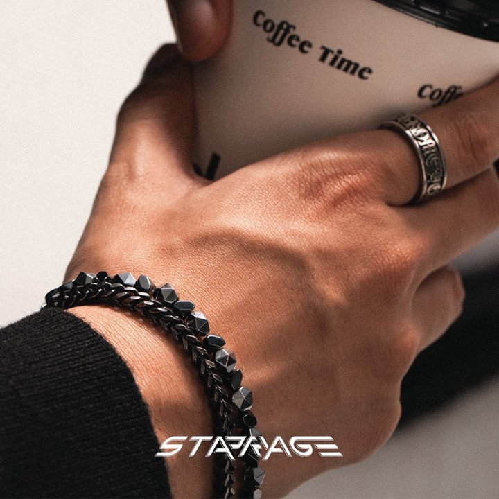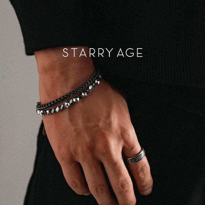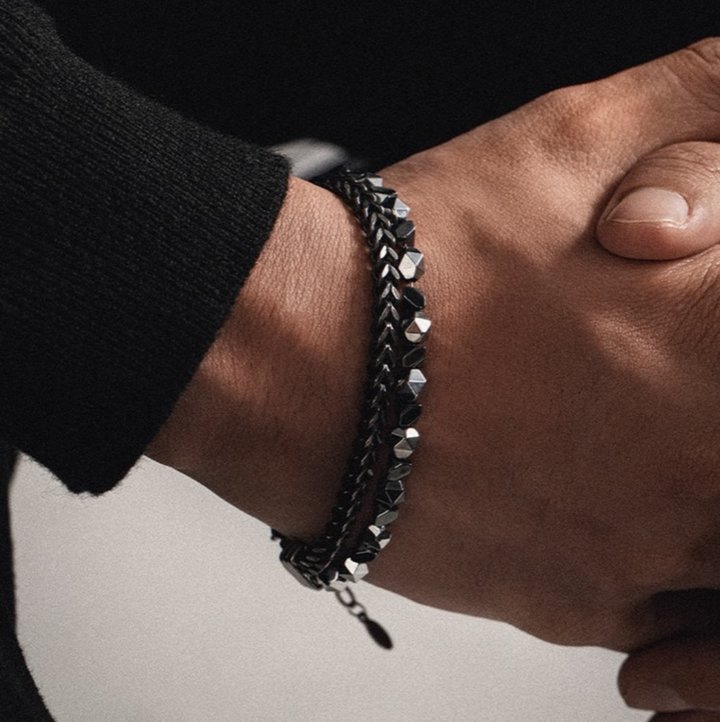 这条几何金属手链乍看专属于酷酷的男生,实际上不挑人。由龙骨链和黑胆石+太赫磁石两根链子构成。