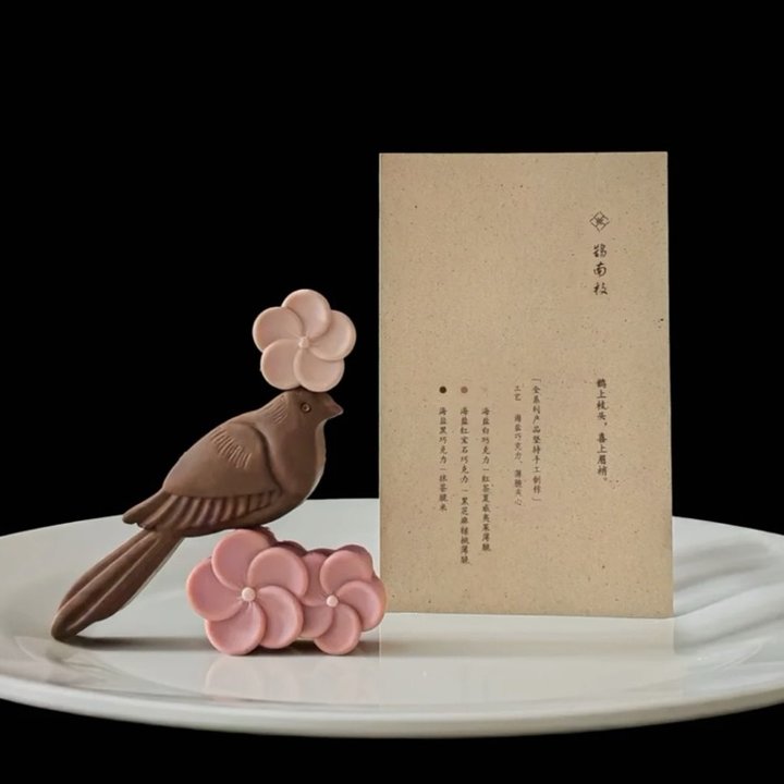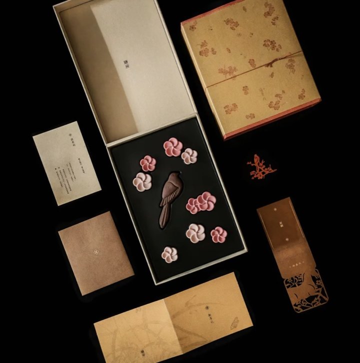 包装灵感源自古代糕点,红线系着喜鹊剪纸,寓意“喜上眉梢”。