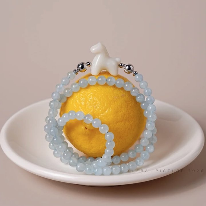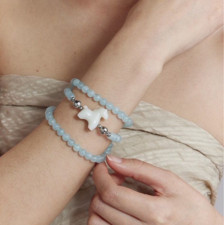 海蓝宝串珠搭配温润的白玉小马,戴在手上显白又温柔。