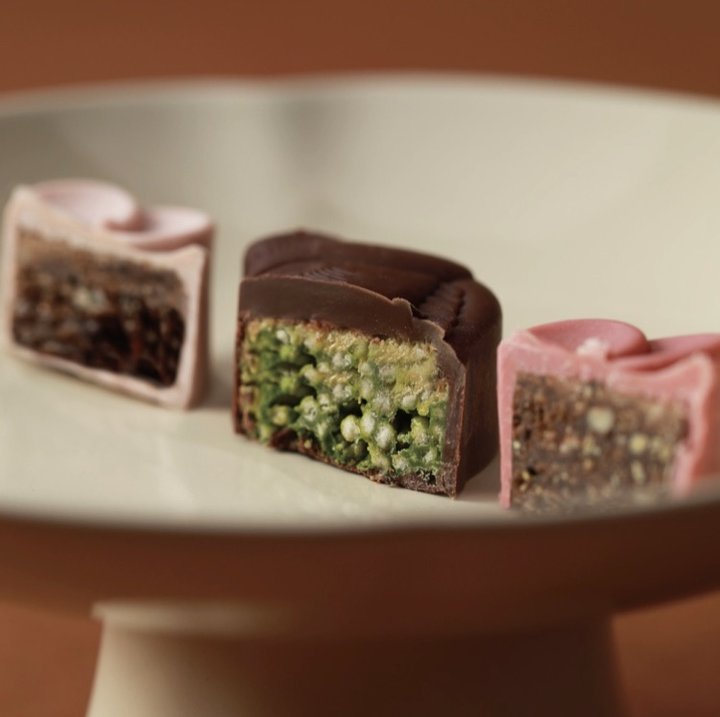 巧克力设计成了“九九消寒图”的梅花样式,黑巧、白巧、红宝石巧克力三种风味,内含抹茶、黑芝麻等薄脆。