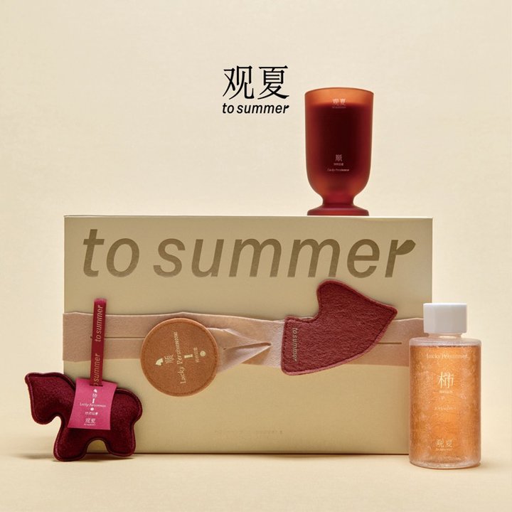 观夏的东方美学从未让人失望。这盒「一室春绥」香氛礼盒,从名字到内容都满载美好寓意:“柿柿如意”的香插、“马上好运”的毛毡小马、“杯杯好运”的福杯……