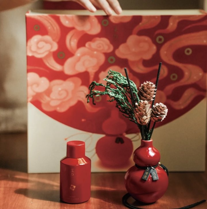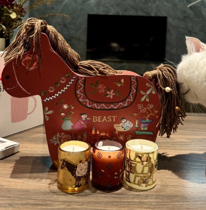 里面有三款香薰蜡烛,迎岁「醉马观花」、安岁「香橼佛手」、守岁「无忌之檀」,三个味道都好好闻,摆在家里太有氛围了~